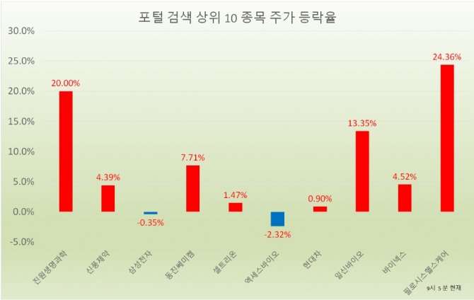 오전 9시 5분 현재 포털사가 집계하는 검색량 기준 상위 20개 종목의 현황은 다음과 같다.