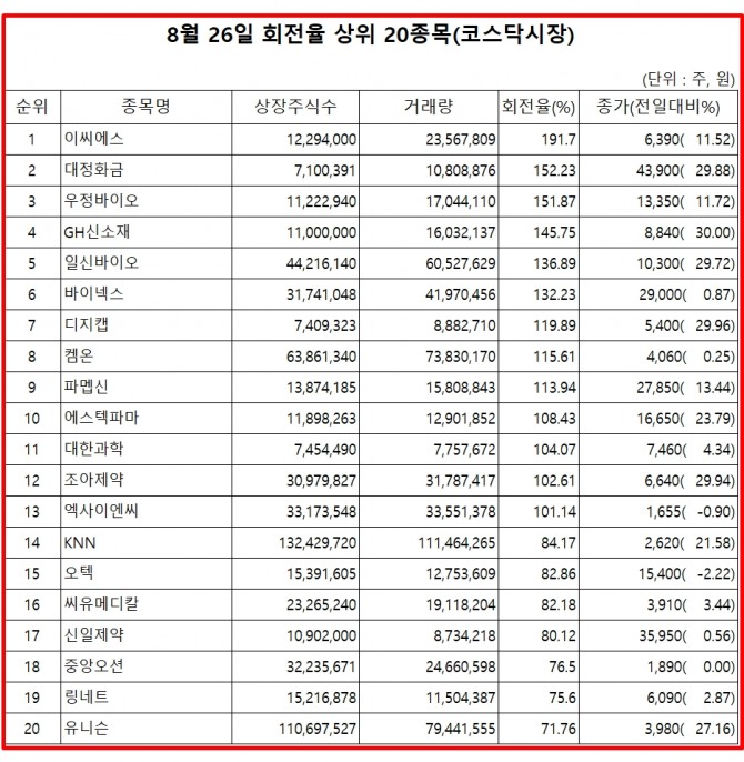 26일 증권시장에서 코스닥 종목의 거래량 회전율 기준 상위 종목은 다음과 같다.