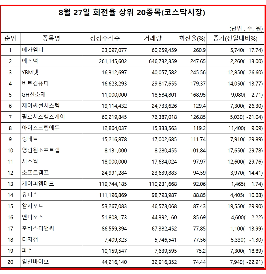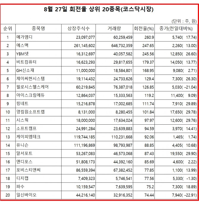 27일 증권시장에서 코스닥 종목의 거래량 회전율 기준 상위 종목은 다음과 같다.