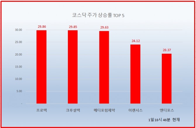 1위 프로텍 28050원 ( 29.86% ), 2위 크루셜텍 2545원 ( 29.85% ), 3위 메디포럼제약 11550원 ( 29.63% ), 4위 이랜시스 2470원 ( 24.12% ), 5위 앤디포스 5200원 ( 20.37% ), 6위 원풍물산 2615원 ( 21.91% ), 7위 세동 803원 ( 21.12% ), 8위 에이디칩스 834원 ( 20.52% ), 9위 시너지이노베이션 3460원 ( 17.29% ), 10위 오리엔탈정공 2205원 ( 16.36% ),