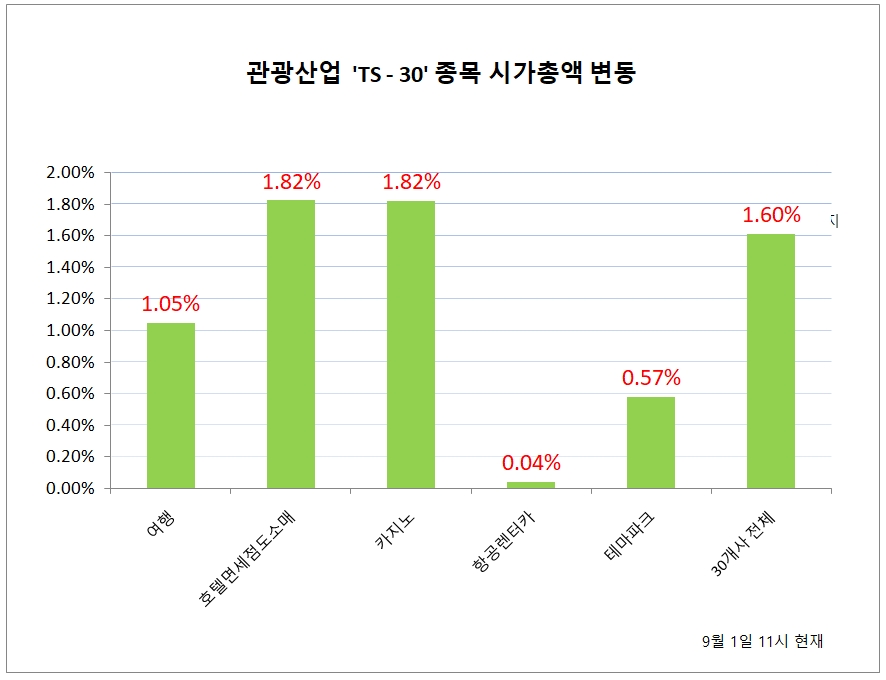1일 11시 현재 관광분야 30개 대표 상장기업의 시가총액은 지난 31일 마감 대비 9314억 원 증가한 58조9669억 원을 가리키고 있다.