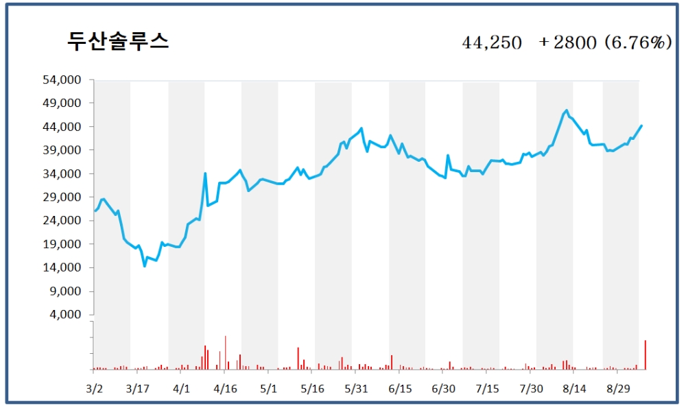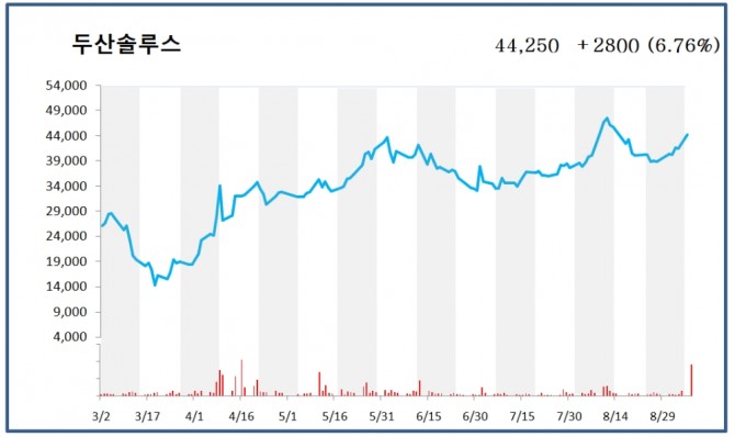 이날 두산솔루스 주가는 전 거래일 대비 6.76% 상승한 4만4250원에 장을 마감했다. 장중 한때 5만200원 까지 급등하기도 했지만, 이후 상승폭을 일부 반납했다.