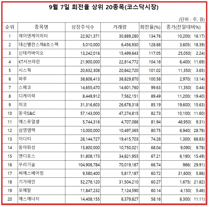 7일 증권시장에서 코스닥 종목의 거래량 회전율 기준 상위 종목은 다음과 같다.