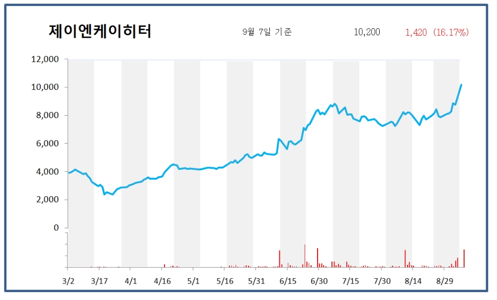 이미지 확대보기제이엔케이히터는 7일 코스닥 시장에서 상장주식수 대비 거래량 비율이 가장 높았으며. 이날 주가는 16.17% 상승한 10200원에 장을 마감했다.
