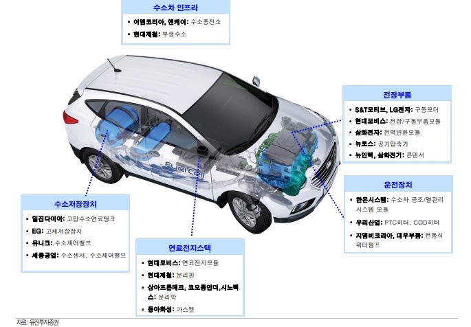 유진투자증권은 수소차 시장을 선도하고 있는 현대차의 수소차 경쟁력은 국내에 있는 부품ㆍ소재 업체들과의 협업능력에 근간을 두고 있다면서 일부 소재를 제외하고 대부분의 소재ㆍ부품을 국산화했고, 가장 빠르게 대량 생산체제화 하고 있다고 평가했다. 이에 따라 한국의 수소차 부품ㆍ소재업체들의 글로벌 경쟁력을 단기간에 따라올 국가는 찾기 어렵다고 진단하고 정부의 적극적인 수소차 확대정 책의 결과물이라고 덧붙였다.