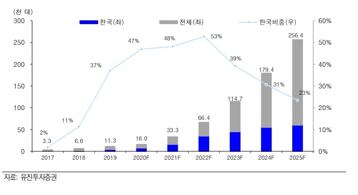 이미지 확대보기유진투자증권은 2019~2025년 글로벌 수소차 시장이 연평균 68% 성장할 것으로 예상한다.수소차 판매는 지난해 1만1300대에서 올해 1만600대, 내년 3만3300대, 2022년 6만6400대, 2023년 11만4700대, 2024년 17만9400대, 2025년 25만6000대로 커질 것으로 유진증권은 내다봤다. 한국의 점유율은 2025년 전세계 시장의 23%를 차지할 것으로 유진투자증권은 전망했다.