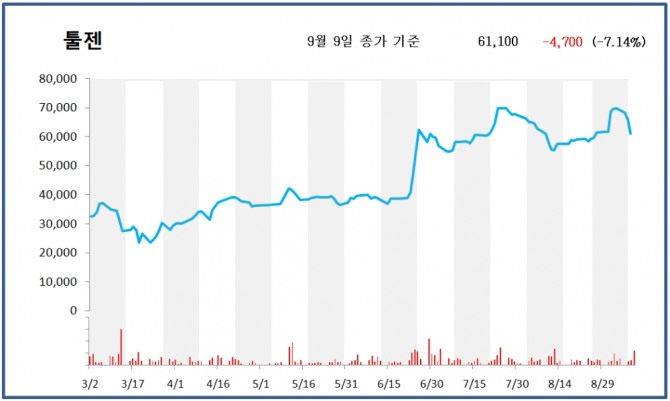 툴젠은 이날 전일대비 7.14% 하락한 6만1100원으로 장을 마감했다.