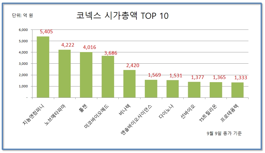 ▲1위 지놈앤컴퍼니(5405억 원) ▲2위 노브메타파마(4222억 원) ▲3위 툴젠(4016억 원) ▲4위 미코바이오메드(3686억 원) ▲5위 비나텍(2420억 원) ▲6위 엔솔바이오사이언스(1569억 원) ▲7위 다이노나(1531억 원) ▲8위 선바이오(1377억 원) ▲9위 TS트릴리온(1365억 원) ▲10위 프로테옴텍(1333억 원)