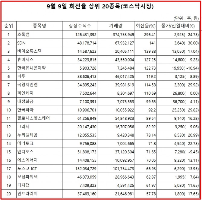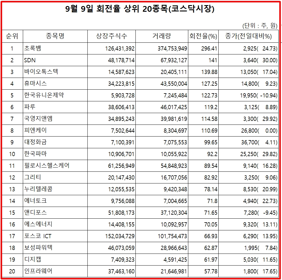 [표] 9월 9일 회전율 상위 20 종목 (코스닥시장)