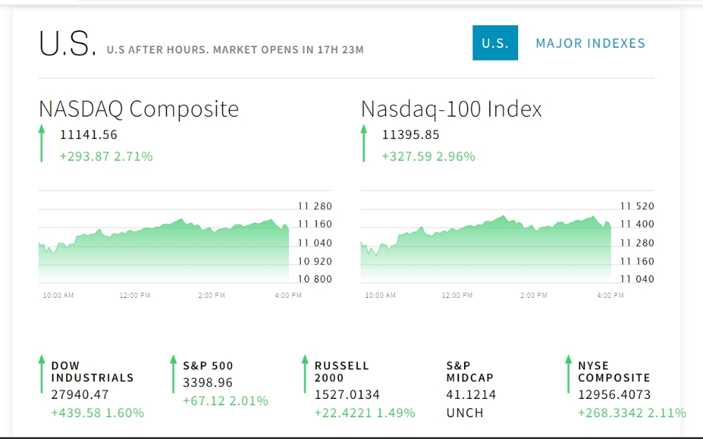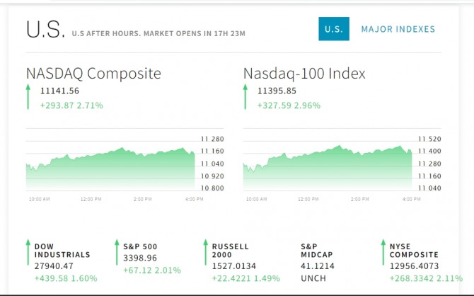 이닐 뉴욕증시는 아스트라제네카 코로나백신에 대한 영국 당국의 입장과 기술주 투매 현상 진정으로 반등했다. 뉴욕증권거래소(NYSE)에서 다우존스 30 산업평균지수는 전장보다 439.58포인트(1.6%) 상승한 27,940.47에 마쳤다. 스탠더드앤드푸어스(S&P) 500 지수는 67.12포인트(2.01%) 오른 3,398.96에 끝났다. 기술주의 나스닥 지수는 293.87포인트(2.71%) 급등한 11,141.56에 장을 마감했다.