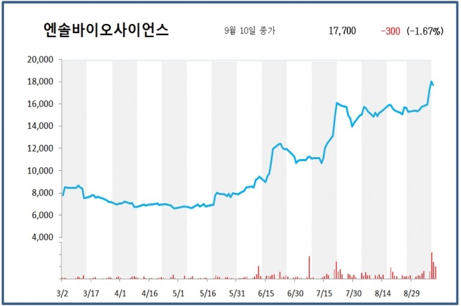 엔솔바이오사이언스는 전일대비 1.67% 하락한 1만7700원으로 장을 마감했다.