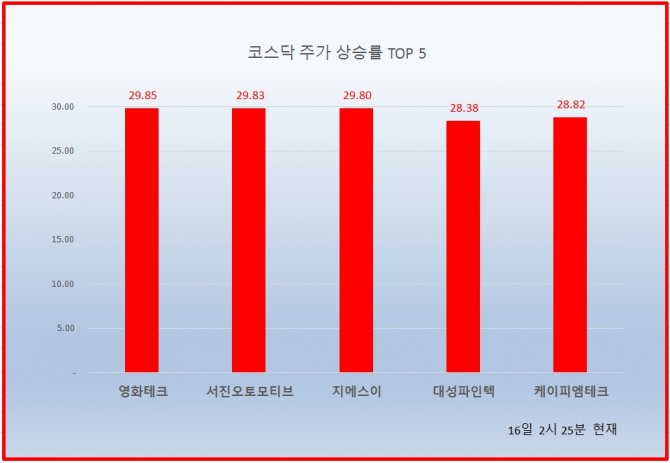 1위 영화테크 21750원 ( 29.85% ), 2위 서진오토모티브 2350원 ( 29.83% ), 3위 지에스이 1960원 ( 29.8% ), 4위 대성파인텍 1945원 ( 28.38% ), 5위 케이피엠테크 2570원 ( 28.82% ), 6위 한국정보인증 9360원 ( 25.81% ), 7위 오킨스전자 12550원 ( 26.51% ), 8위 한국정밀기계 1650원 ( 22.22% ), 9위 덴티스 2145원 ( 20.85% ), 10위 뉴인텍 3240원 ( 17.39% )