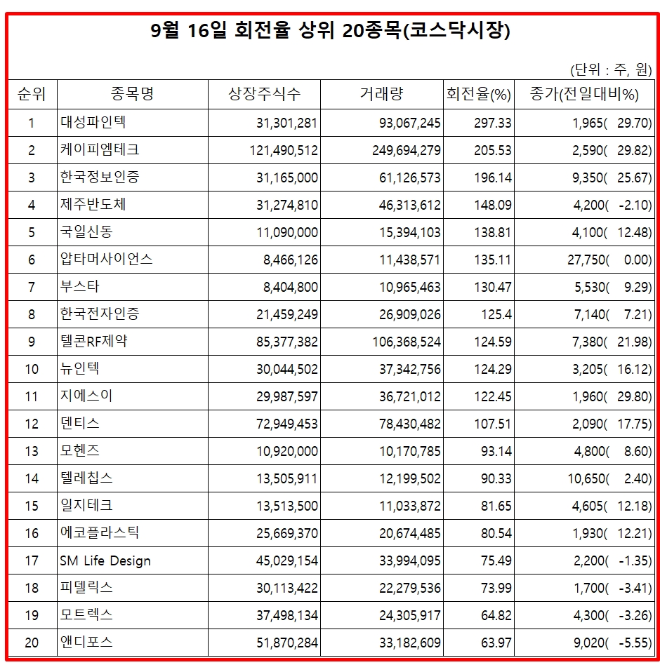 16일 증권시장에서 코스닥 종목의 거래량 회전율 기준 상위 종목은 다음과 같다.