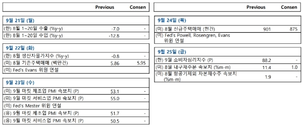 미국 5차 경기부양책 합의여부도 관건이다. 트럼프 대통령은 공화당을 향해 부양책 규모를 키워야 한다고 압박하고 있다. 부양책규모에 대해 공화당 3000억 달러, 민주당 2조2000억 달러로 평행선을 달리는 상황에서 트럼프의 압박이 공화당의 양보로 이어질지 주목된다. 연준도 추가 부양책 마련을 촉구한 만큼 양당간 접점을 찾기 위한 논의는 계속될 것으로 보인다.
