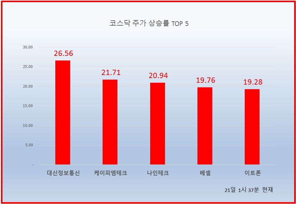 1위 대신정보통신 1620원 ( 26.56% ), 2위 케이피엠테크 3700원 ( 21.71% ), 3위 나인테크 3465원 ( 20.94% ), 4위 베셀 4030원 ( 19.76% ), 5위 이트론 198원 ( 19.28% ), 6위#에이치엘비생명과학 34850원 ( 17.94% ), 7위 신성델타테크 7500원 ( 16.46% ), 8위 상지카일룸 1885원 ( 16% ), 9위 나라엠앤디 9330원 ( 15.61% ), 10위 화일약품 15750원 ( 13.72% )