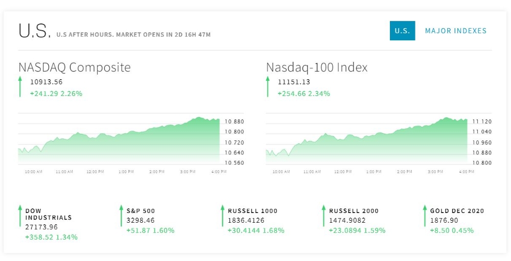 이날 뉴욕증시는 혼조세로 출발했으나 시간이 흐르면서 큰 폭의 상승세로 돌아섰다. 뉴욕증권거래소(NYSE)에서 다우존스 30 산업평균지수와 스탠더드앤드푸어스(S&P) 500 지수 그리고 기술주의 나스닥 지수 모두 올랐다. 다우존스 30 산업평균지수는 358.52포인트(1.34%) 상승한 27,173.96에 마쳤다. 스탠더드앤드푸어스(S&P) 500 지수는 51.87포인트(1.6%) 오른 3,298.46에 기술주의 나스닥 지수는 241.3포인트(2.26%) 급등한 10,913.56에 마감했다. 주간단위로는 다우지수가 이번 주 1.75% 내렸다. S&P500 지수는 0.63% 내렸다. 반면 나스닥은 1.11% 상승했다. 다우지수와 S&P 500 지수는 4주 연속 하락했다.
