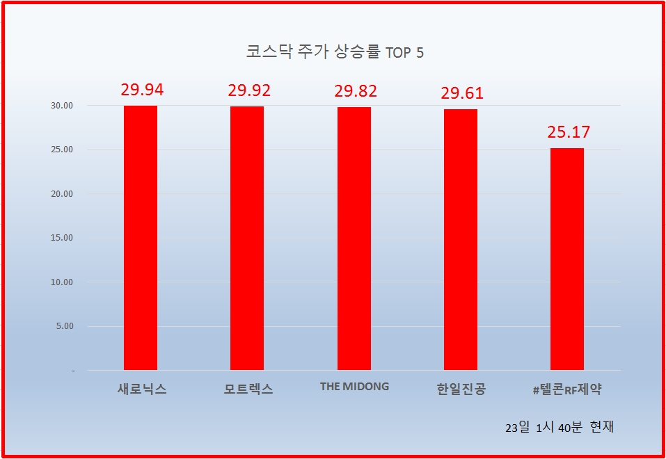 1위 새로닉스 6120원 ( 29.94% ), 2위 모트렉스 5840원 ( 29.92% ), 3위 THE MIDONG 2220원 ( 29.82% ), 4위 한일진공 1055원 ( 29.61% ), 5위#텔콘RF제약 9350원 ( 25.17% ), 6위 줌인터넷 5800원 ( 24.73% ), 7위 텔레칩스 11550원 ( 23% ), 8위 모바일어플라이언스 4880원 ( 22.31% ), 9위 코디엠 249원 ( 19.71% ), 10위 라닉스 9250원 ( 17.68% )