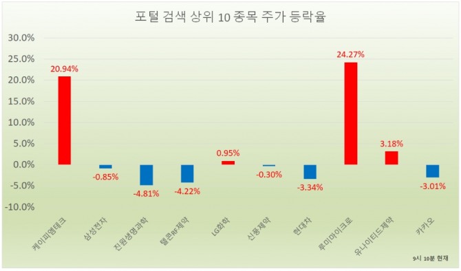 오전 9시 10분 현재 포털사가 집계하는 검색량 기준 상위 20개 종목의 현황은 다음과 같다.