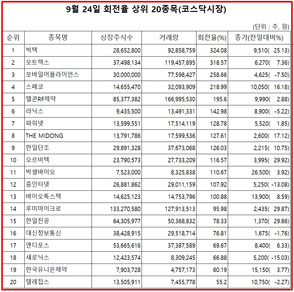24일 증권시장에서 코스닥 종목의 거래량 회전율 기준 상위 종목은 다음과 같다.