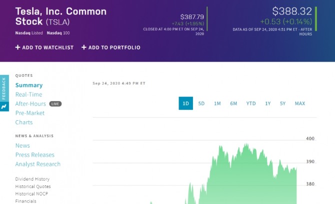 이미지 확대보기24일(미국 현지시각) 뉴욕증권거래소에서 테슬라 주가는 한때 주당 399달러까지 올라갔다가 387.79달러로 거래를 마쳤다. 시가총액은 3613억 4600만 달러로 집계됐다.