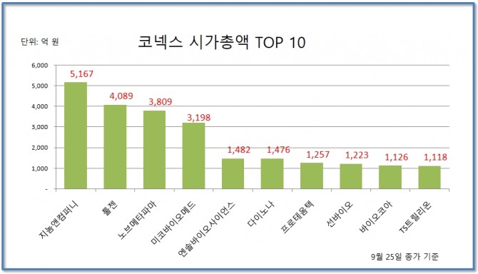 ▲1위 지놈앤컴퍼니(5167억 원) ▲2위 툴젠(4089억 원) ▲3위 노브메타파마(3809억 원) ▲4위 미코바이오메드(3198억 원) ▲5위 엔솔바이오사이언스(1482억 원) ▲6위 다이노나(1476억 원) ▲7위 프로테옴텍(1257억 원) ▲8위 선바이오(1223억 원) ▲9위 바이오코아(1126억 원) ▲10위 TS트릴리온(1118억 원)