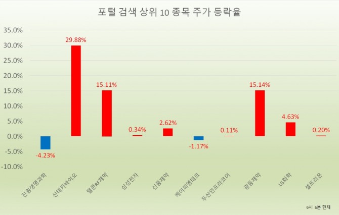 오전 9시 6분 현재 포털사가 집계하는 검색량 기준 상위 20개 종목의 현황은 다음과 같다.