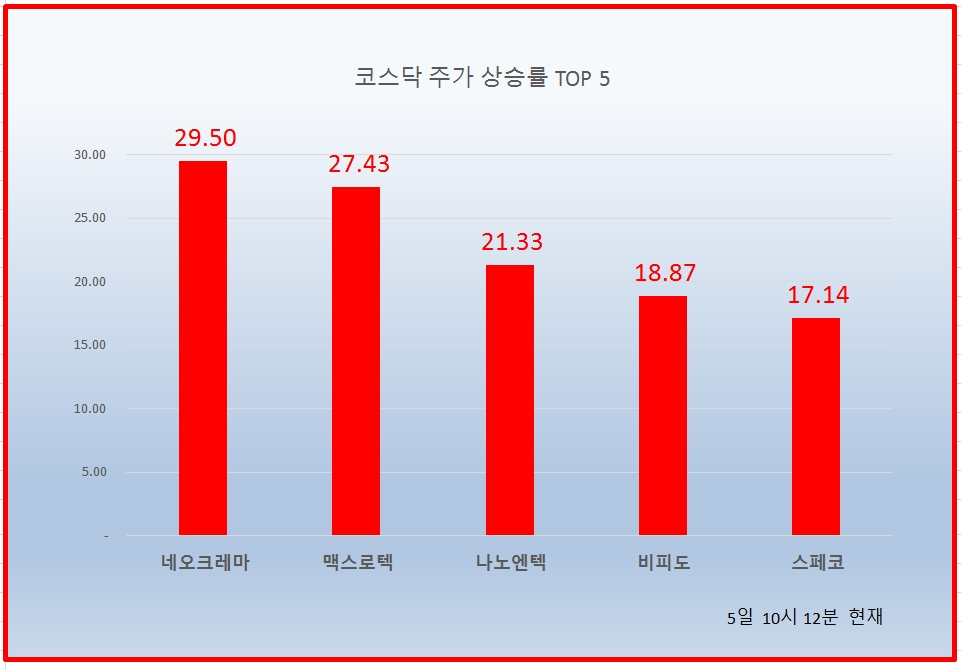 5일 10시 12분 현재 코스닥 상승률 상위 50개 종목은 다음과 같다.