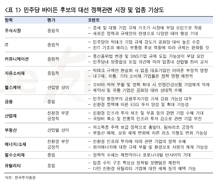 시장은 대선 전까지 경계심리가 팽배할 것으로 전망하며 빠르게 바이든 후보의 정책 수혜주가 주목을 받게 될 것으로 예상된다.