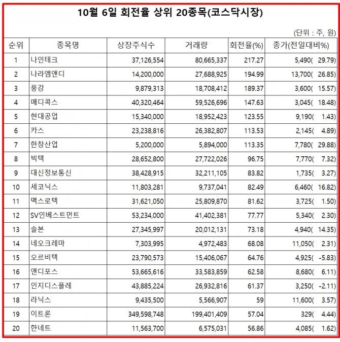 표기순서는 거래량 회전율 순위, 종목명, 거래량 회전율, 6일 종가, 주가 등락율 순이다.