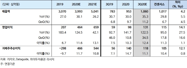 김민정 하이투자증권 연구원도 "성장동력인 톡보드 광고의 일 매출액은 3분기에도 증가세가 이어질 것”이라며 “올해 연말까지 1만 개를 예상한 광고주 수는 3 분기에 이미 달성한 것으로 파악되는데, 비대면(언택트) 소비 증가 속에서 선물하기뿐만아니라 톡스토어 등 커머스 거래액도 꾸준히 증가하고 있다”고 평가했다.