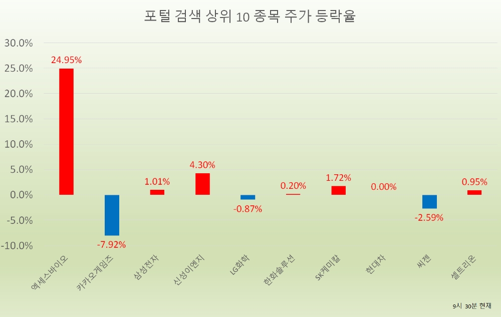 오전 9시 30분 현재 포털사가 집계하는 검색량 기준 상위 20개 종목의 현황은 다음과 같다.