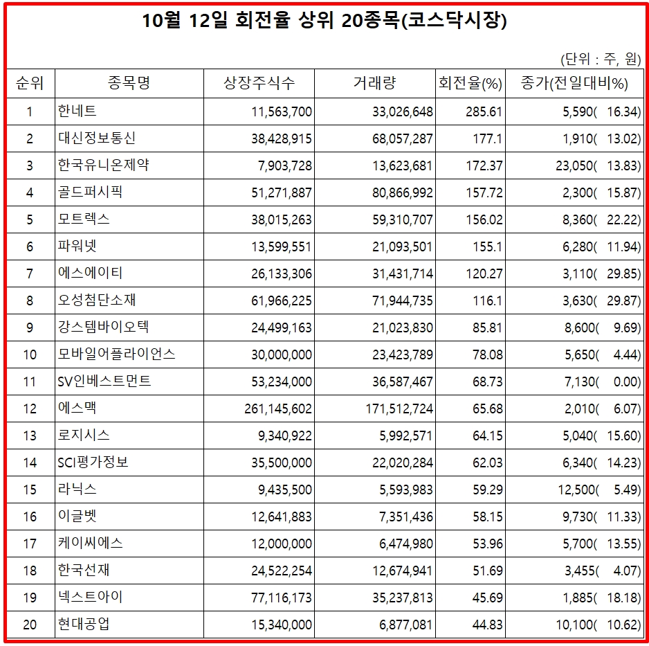 12일 증권시장에서 코스닥 종목의 거래량 회전율 기준 상위 종목은 다음과 같다.