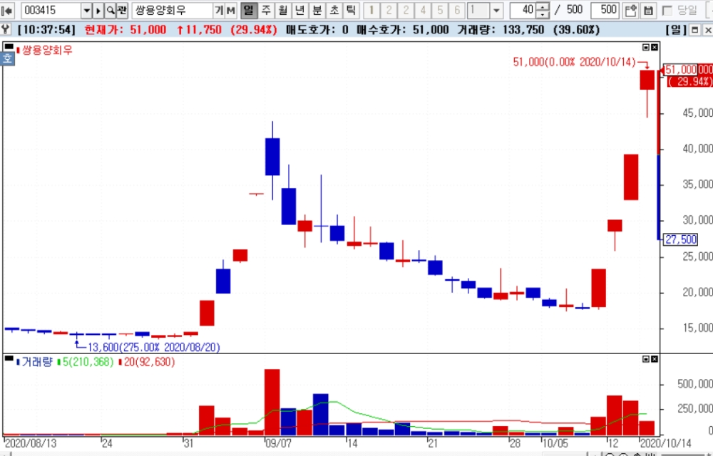 이날 쌍용양회는 전일 대비 1만1750원(29.94%) 오른 5만1000원에 거래되고 있다.