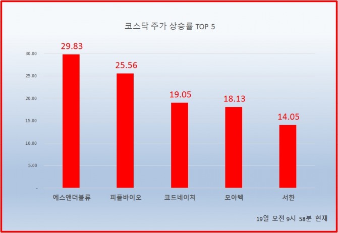 19일 오전 9시 58분 현재 코스닥 상승률 상위 50개 종목은 다음과 같다.
