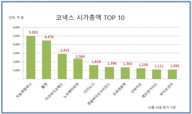 ▲1위 지놈앤컴퍼니(5003억 원) ▲2위 툴젠(4476억 원) ▲3위 미코바이오메드(2915억 원) ▲4위 노브메타파마(2366억 원) ▲5위 다이노나(1618억 원) ▲6위 엔솔바이오사이언스(1396억 원) ▲7위 프로테옴텍(1363억 원) ▲8위 선바이오(1239억 원) ▲9위 에프앤가이드(1111억 원) ▲10위 바이오코아(1095억 원)