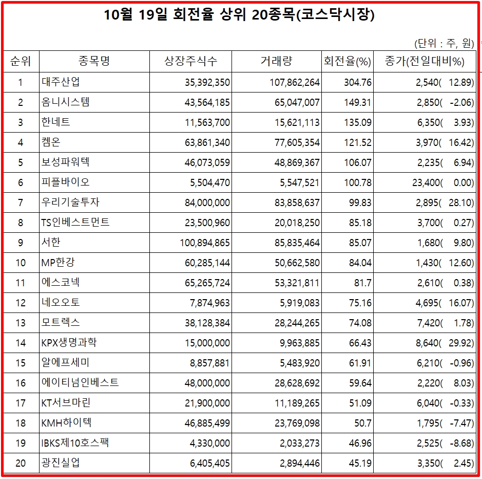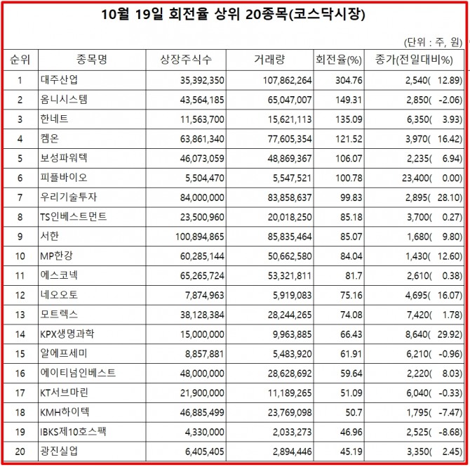 표기순서는 거래량 회전율 순위, 종목명, 거래량 회전율, 19일 종가, 주가 등락율 순이다.