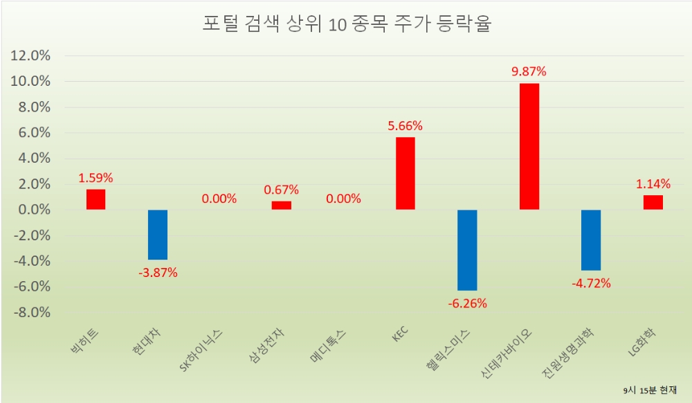 오전 9시 15분 현재 포털사가 집계하는 검색량 기준 상위 20개 종목의 현황은 다음과 같다. ·