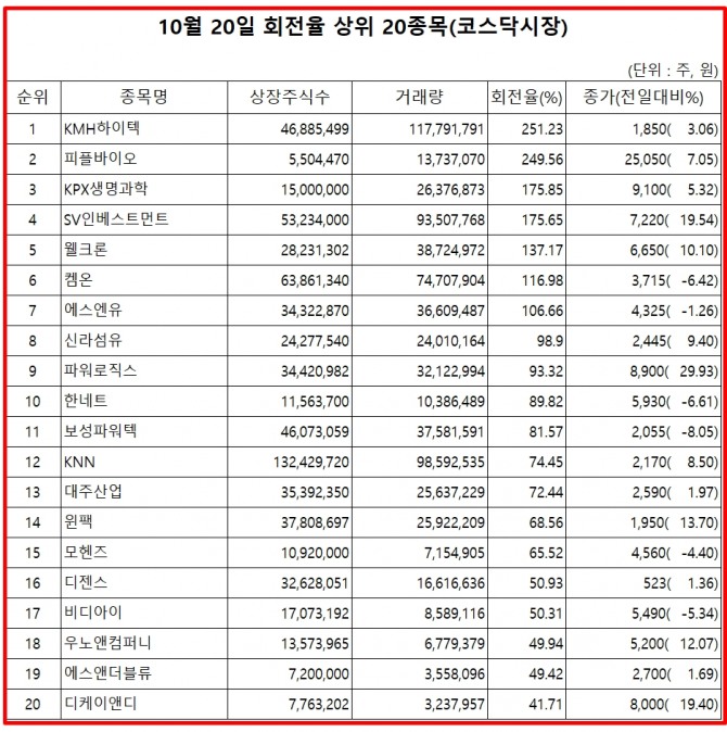 20일 증권시장에서 코스닥 종목의 거래량 회전율 기준 상위 종목은 다음과 같다.