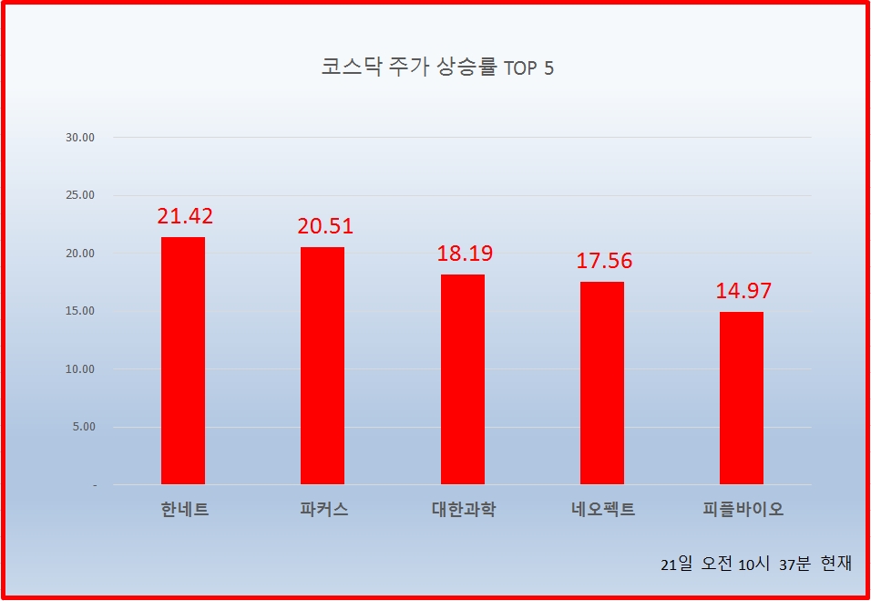 1위 한네트 7200원 ( 21.42% ), 2위 파커스 3320원 ( 20.51% ), 3위 대한과학 9810원 ( 18.19% ), 4위 네오펙트 4485원 ( 17.56% ), 5위 피플바이오 28800원 ( 14.97% ), 6위 웰크론한텍 3045원 ( 12.36% ), 7위 대동기어 3235원 ( 11.74% ), 8위 네스엠 2240원 ( 10.07% ), 9위 로지시스 5200원 ( 12.92% ), 10위 코나아이 26150원 ( 9.19% )