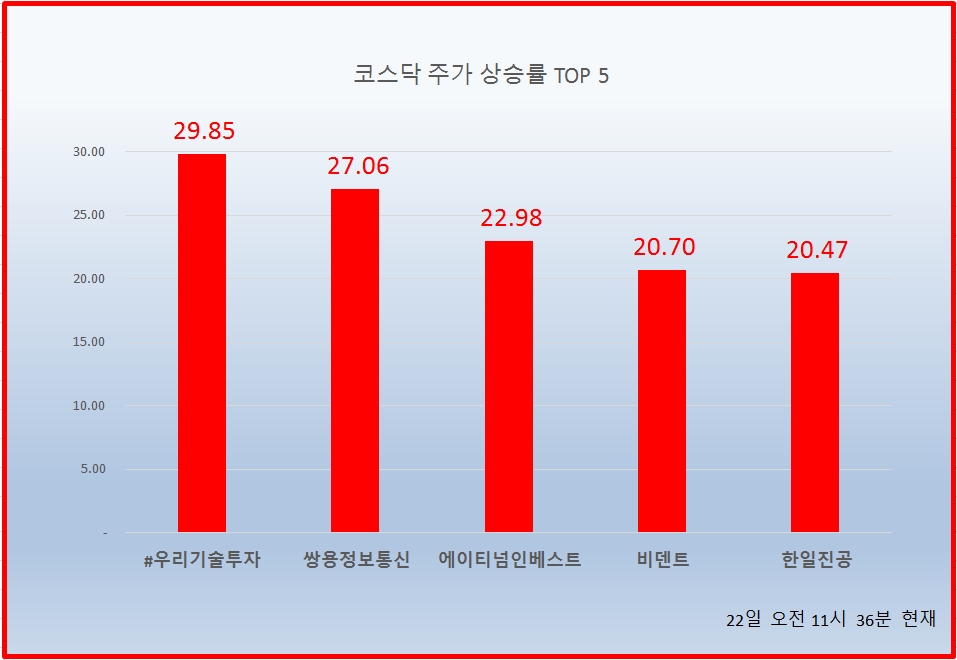 1위#우리기술투자 3850원 ( 29.85% ), 2위 쌍용정보통신 1620원 ( 27.06% ), 3위 에이티넘인베스트 2515원 ( 22.98% ), 4위 비덴트 7290원 ( 20.7% ), 5위 한일진공 1530원 ( 20.47% ), 6위 대한과학 12750원 ( 18.6% ), 7위 시노펙스 5440원 ( 17.49% ), 8위 SCI평가정보 6440원 ( 14.59% ), 9위 신라섬유 2630원 ( 13.61% ), 10위 대화제약 15950원 ( 12.32% )