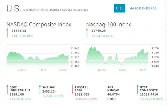 이날 뉴욕증시에서는 코라나 나바이러스 감염증(코로나19) 대응을 위한 추가 부양책과 기업 분기실적 그리고 경제 지표등이 이슈가 됐다. NYSE에서 다우존스 30 산업평균지수와 스탠더드앤드푸어스(S&P) 500 지수 그리고 기술주의 나스닥 지수 모두 강세이다. 테슬라 등의 호실적이 뉴욕증시 상승에 큰 기여를 했다.