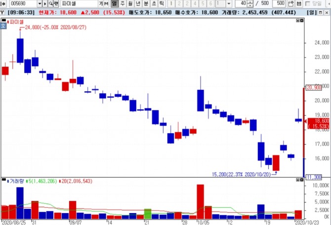 이미지 확대보기23일 주식시장에서 렘데시비르 관련주인 파미셀이 급등하고 있다.