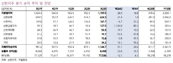 신한지주는 27일 공시를 통해 3분기 당기순이익(연결기준)은 1조1447억 원으로 전분기, 전년동기대비 각각 31.1%, 16.6% 늘었다고 밝혔다. 이는 시장기대치를 웃돈 깜짝 실적이다.