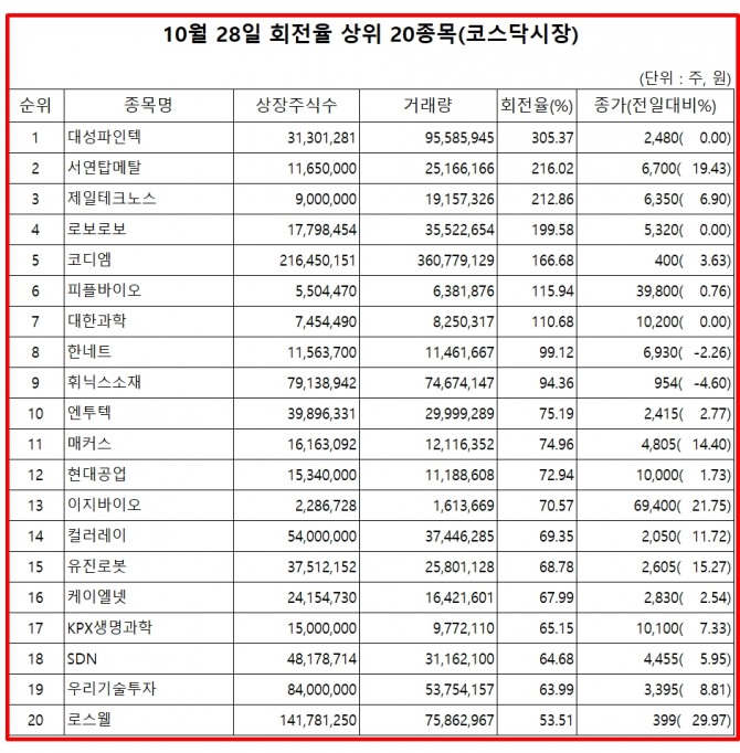 28일 증권시장에서 코스닥 종목의 거래량 회전율 기준 상위 종목은 다음과 같다.