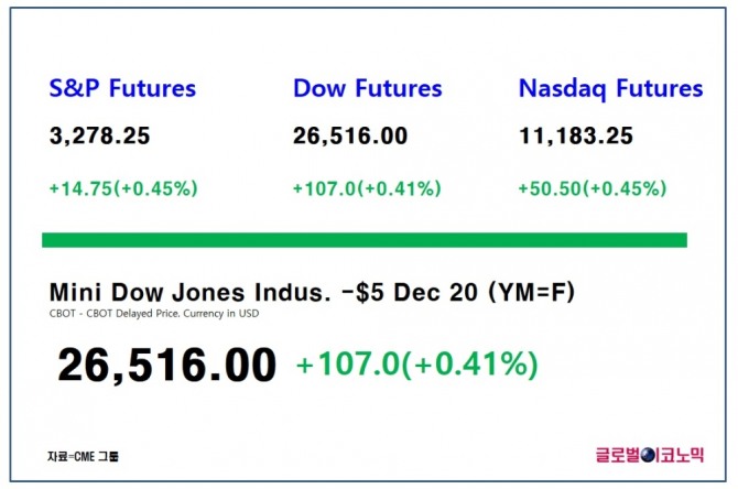 스탠더드 앤드 푸어스(S&P) 500 지수 선물은 0.45%(14.75포인트) 상승한 3278.25에 거래되고 있고, 나스닥 100 선물은 0.45%(50.5포인트)상승한 1만1183.25에 거래되고 있다.