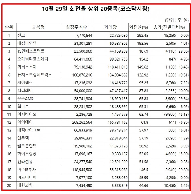 29일 증권시장에서 코스닥 종목의 거래량 회전율 기준 상위 종목은 다음과 같다.