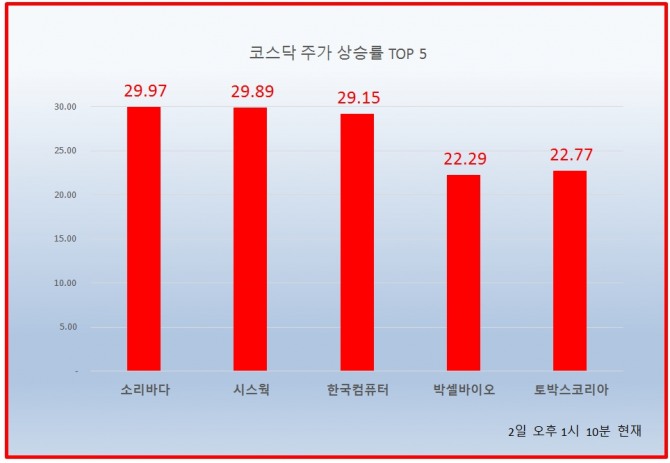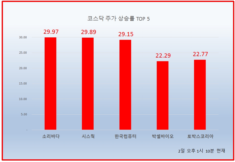 2일 오후 1시 10분 현재 코스닥 상승률 상위 50개 종목은 다음과 같다.