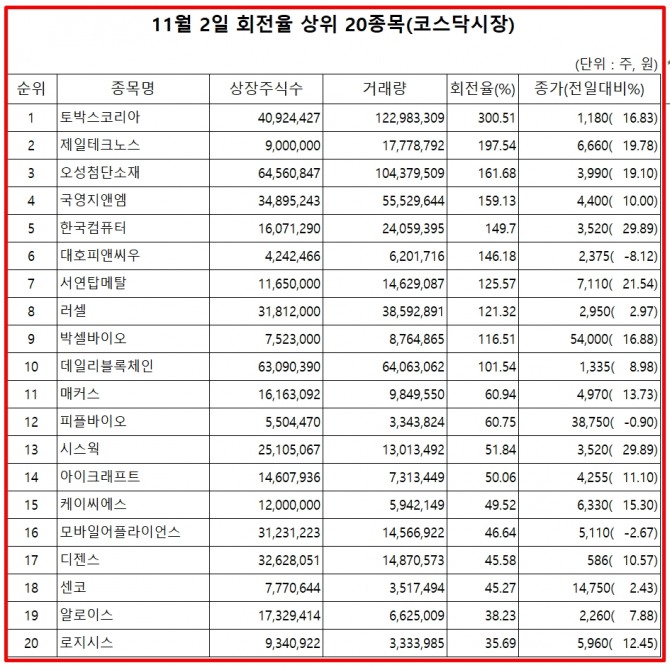 2일 증권시장에서 코스닥 종목의 거래량 회전율 기준 상위 종목은 다음과 같다.