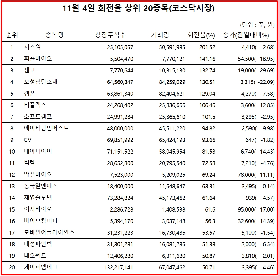 4일 증권시장에서 코스닥 종목의 거래량 회전율 기준 상위 종목은 다음과 같다.