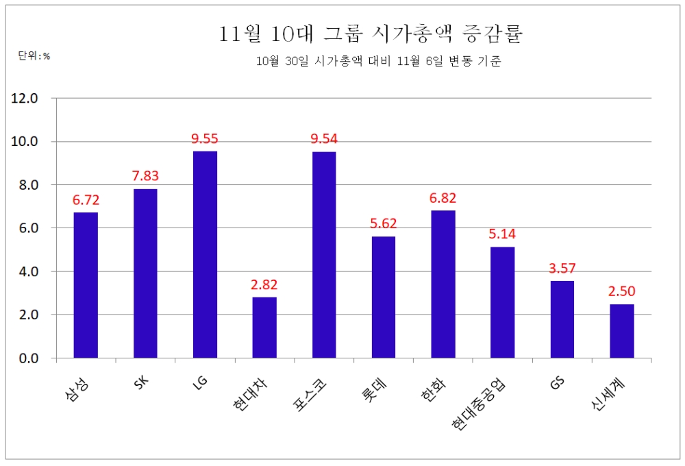 포스코 역시 LG그룹과 비슷한 9.54%의 시가총액 증가율을 기록했다.